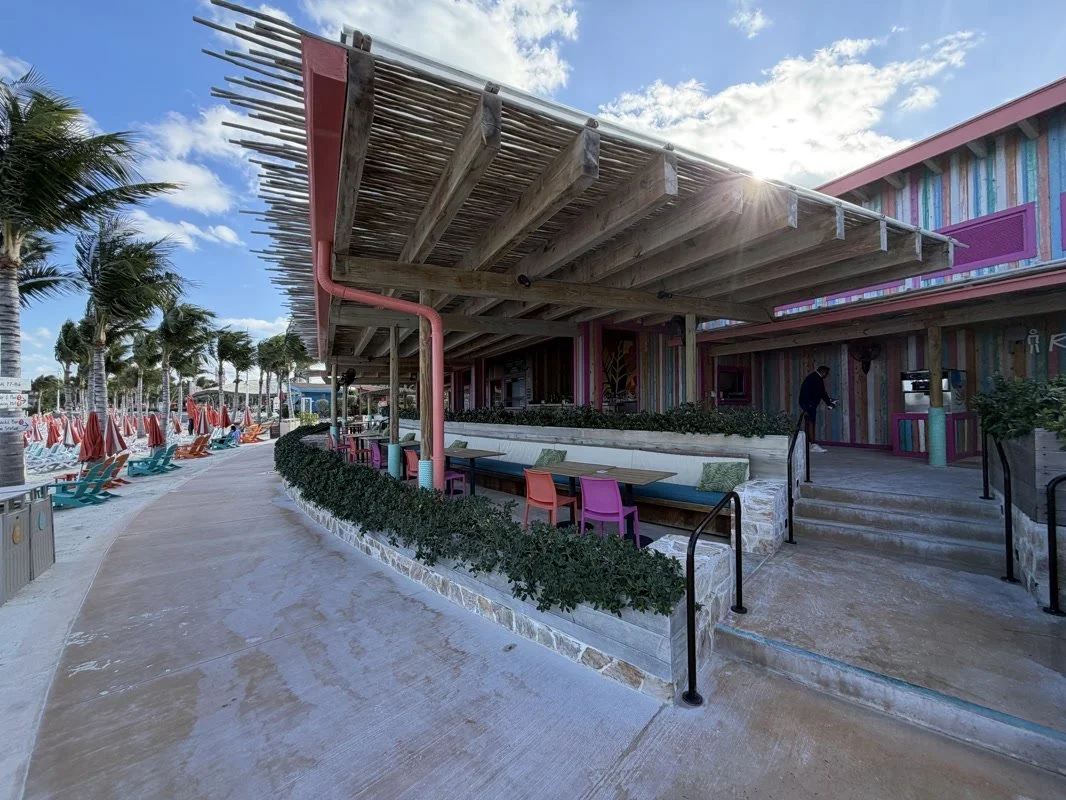 Hideaway Hut serves classic CocoCay favorites like burgers, salads, mozzarella sticks, and chicken sandwiches. In addition, it offers Hideaway Beach exclusive items, including fish sandwiches, coconut shrimp baskets, and caramel brownies. This setup allows guests to enjoy elevated menu options while minimizing wait times, so more time can be spent in the pools or at the beach.